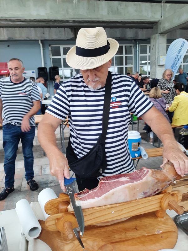 Iz tzv. „donje“ Hrvatske bila je još jedna atrakcija. Uvježbano, naviknuto i spretno s dugačkom uskom oštricom noža veliki pršut tanjili su Boro Jukić i Zvonimir Pervan iz Vrgorca.