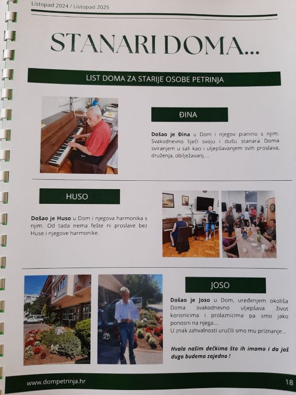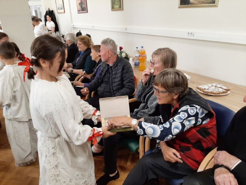 U domu se danas distribuiralo i čitalo najnovije izdanje njihovih novina „Petrinjske staze“, koje je izradila animatorica Martina Matić, a također bake i djedove svojim pjevanjem, plesanjem u narodnim nošnjama i darivanjem kolača i suvenira iznenadili i obradovali učenici 2. razreda OŠ Mate Lovraka. Svi nazočni počašćeni su friškim jutros ispečenim više vrsta slatkih i slanih kolača, a odmah je najavljeno: slijedeća zajednička fešta slijedi za tradicionalno jesensko slavlje sv. Martina, s originalnom ceremonijom krštenja mošta u mlado vino.