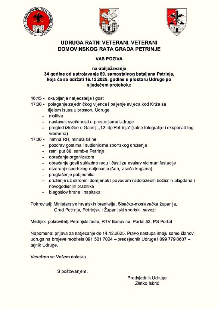 Udruga ratnih veterana, veterani Domovinskog rata Grada Petrinje obilježava 34. obljetnicu ustrojavanja 80. samostalnog bataljuna Petrinja