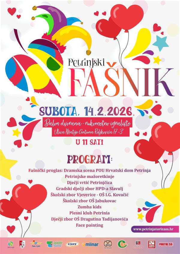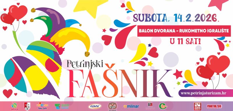 U subotu, 14. veljače 2026. godine, Turistička zajednica Grada Petrinje organizira manifestaciju „Petrinjski fašnik“. Program započinje u 11:00 sati u Balon dvorani Rukometnog igrališta (Ulica Matije Reljkovića 17-3) gdje će gradonačelnica Grada Petrinje Magdalena Komes tradicionalno uručiti „ključ Grada“ malim maškarama i time im simbolično „predati vlast“.