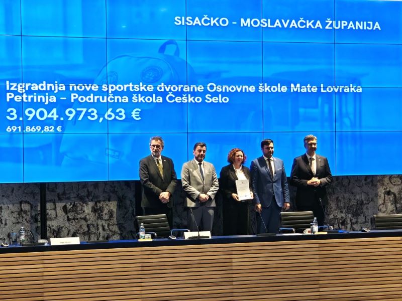 Sisak, 26. veljače 2026. – Župan Ivan Celjak preuzeo je danas ugovore o dodjeli bespovratnih sredstava iz Nacionalnog plana oporavka i otpornosti (NPOO) za tri projekta u osnovnoškolskom obrazovanju ukupne vrijednosti 12,8 milijuna eura. Sredstva su namijenjena za izgradnju tri školske sportske dvorane u osnovnim školama Ivan Goran Kovačić Gora, Rajić i područnoj školi Češko Selo.